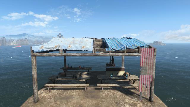Basic Mess Hall with picnic tables and a cooking stove.