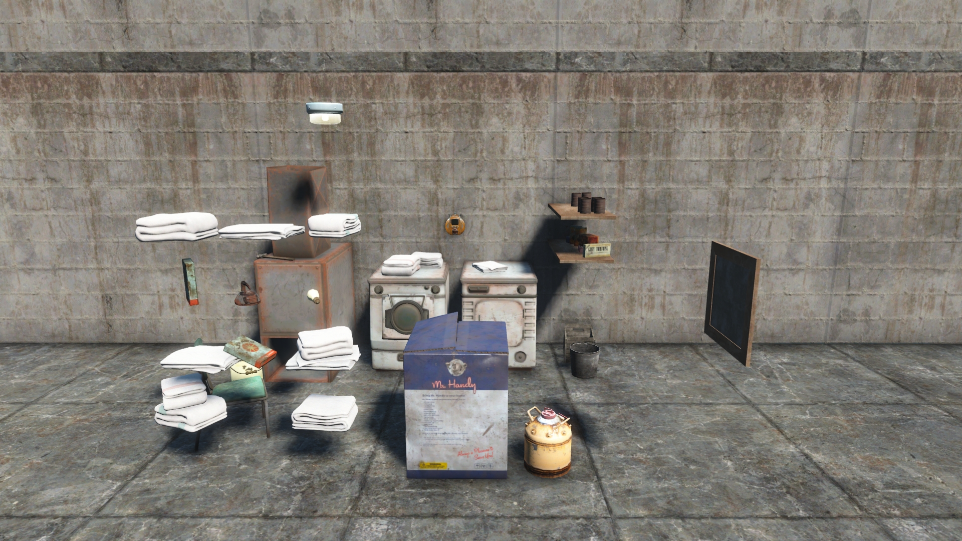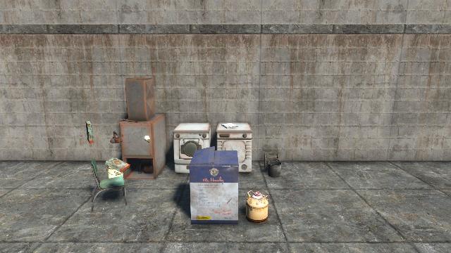 Recreates the player's pre-war laundry room using post-war items. Place against the right laundry room wall.