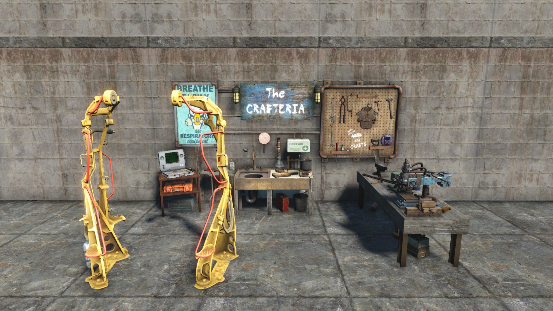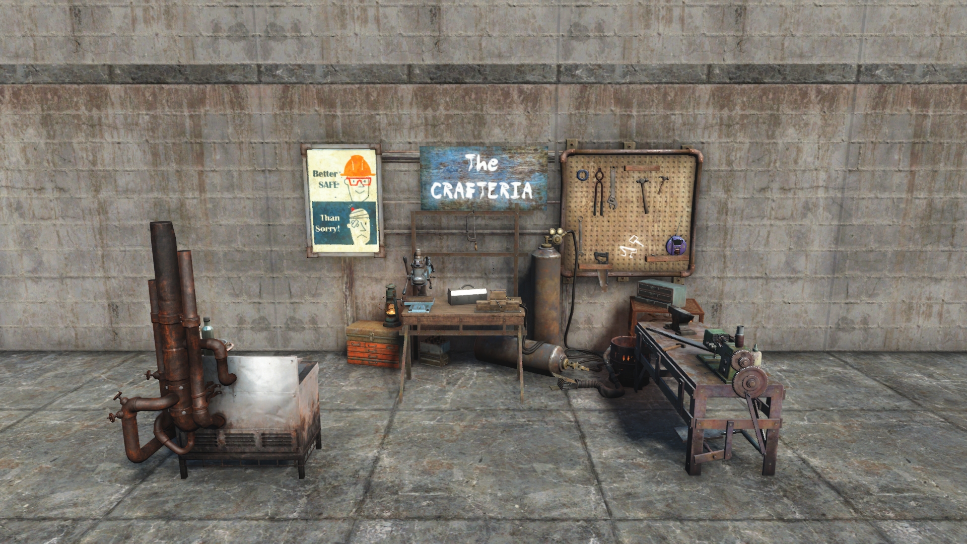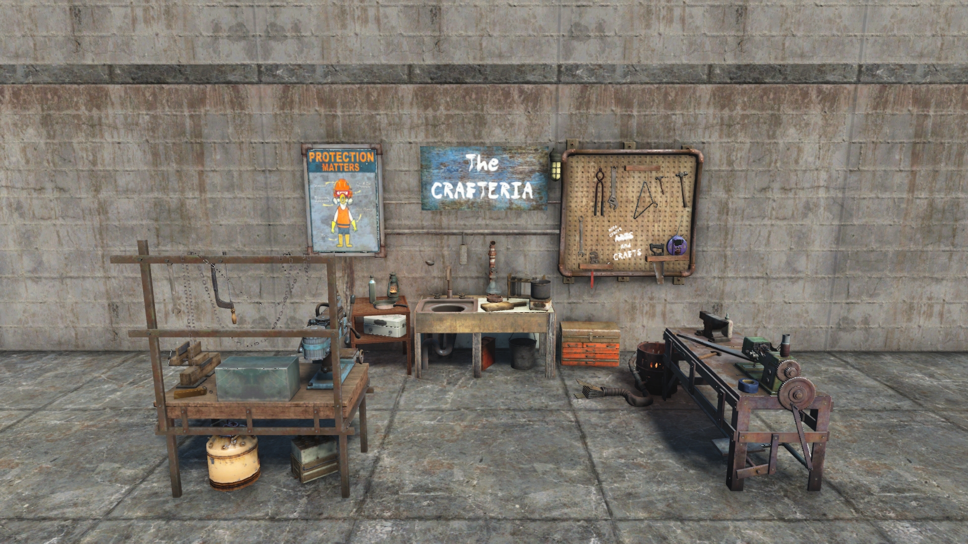 A community workshop with various workbenches. Gains all vanilla workbenches by Level 3. Pathable from left and center front.