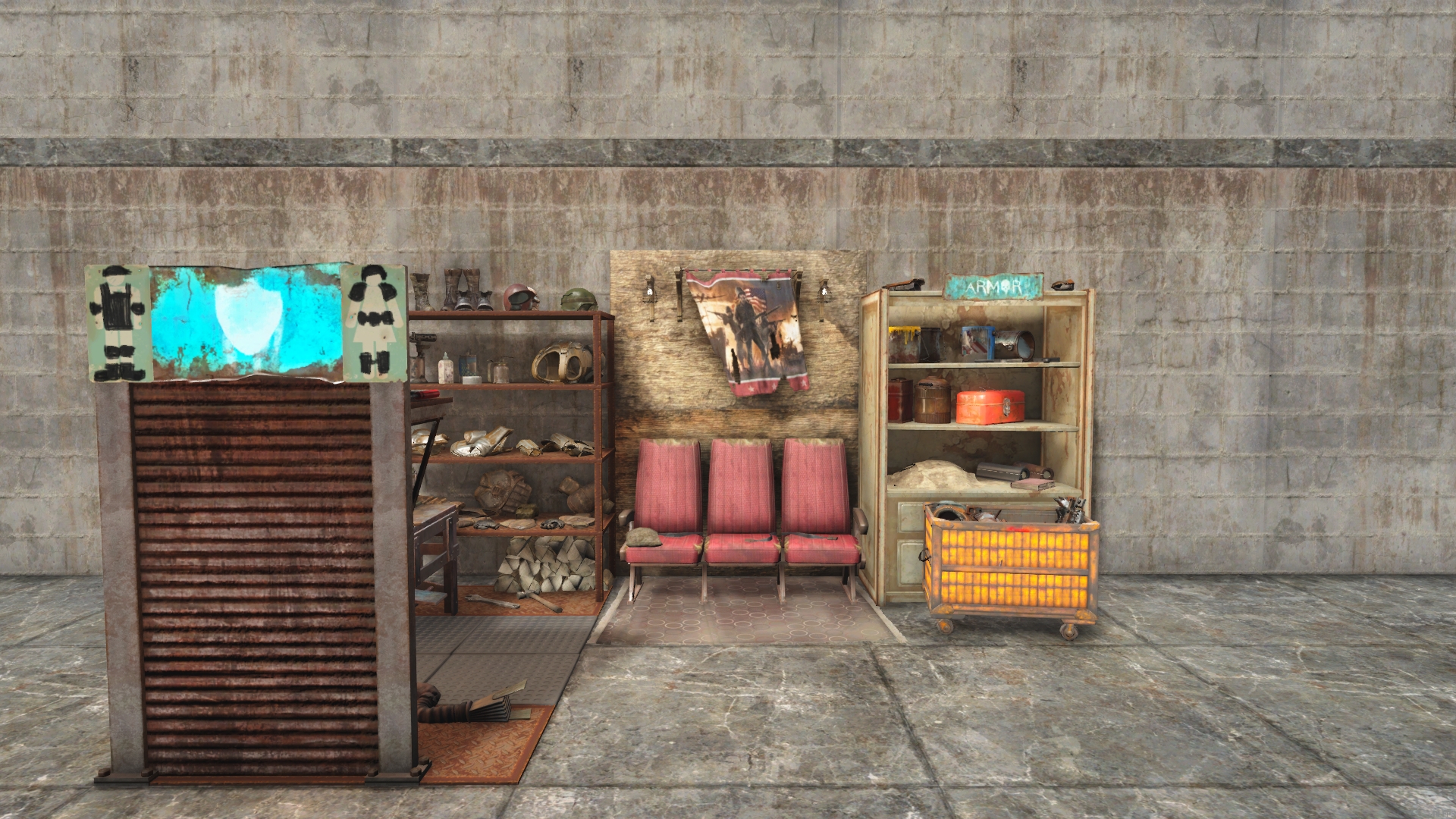 Closed Left side. Includes Armor Workbench. Alt versions: Armor Store, Armory, Battlefield Scavengers. From GavMan's Interiors Addon.