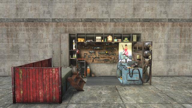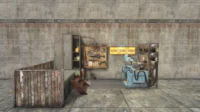 Closed Left side. Includes Weapons Workbench. Alt versions: Weapons Store, Armory, Battlefield Scavengers. From GavMan's Interiors Addon.