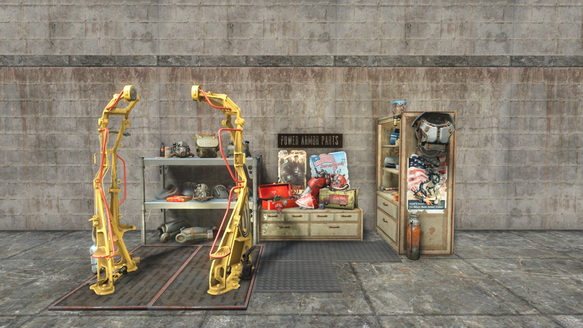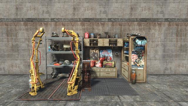 Some access both sides. Includes Power Armor Workbench. Alt versions: Residential, Power Armor Store, Armory. From GavMan's Interiors Addon.